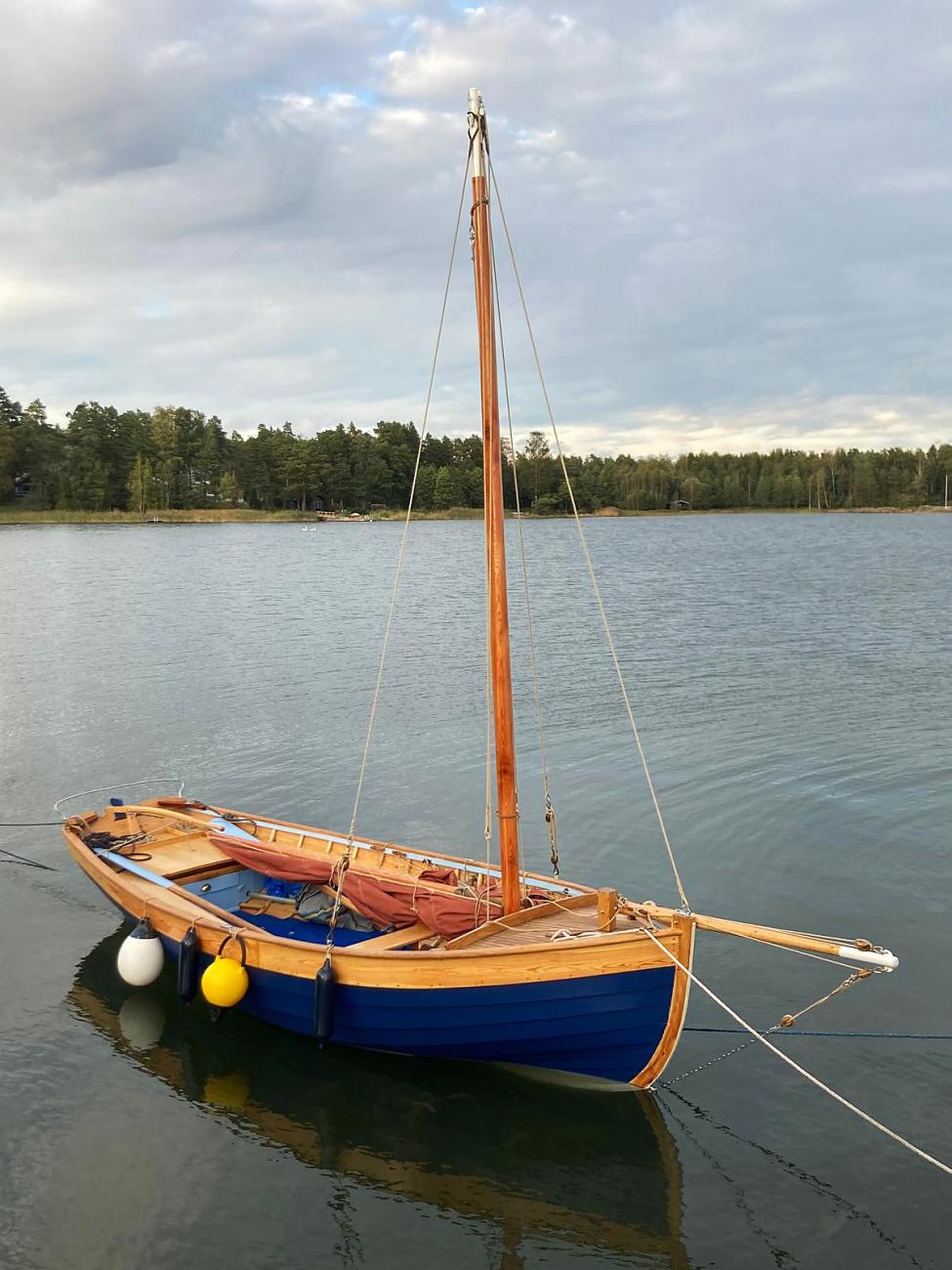 Living by of The Gulf of Finland I wanted to have a small boat that I could easily launch in the spring and take up before the ice covers the sea in the winter. I designed and built the lapstrake boat Kjerstin, named after my grandmother. I have always been interested in wood working, and during the last few years I have built a number of musical instruments (guitars, mandolins, violins etc). Building Kjerstin was, however, my first boat building project. I had pine timber sawn for me, but also used some oak and ash for the steam bent frames. The spars are Oregon pine. Most blocks and fittings are also home made. Last winter, when it was too cold to build outside, I sewed the sails.