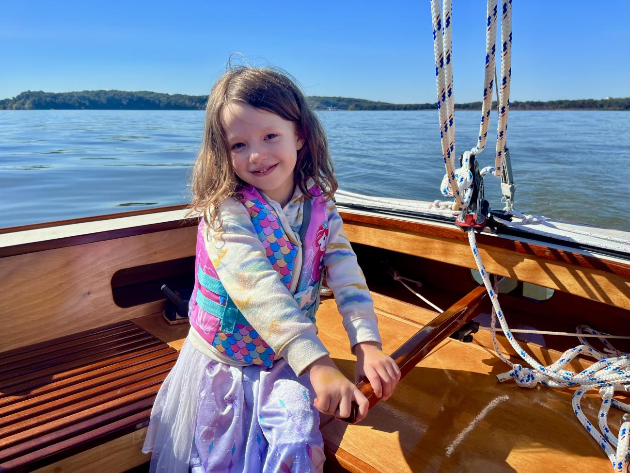 Willow, a 25 ft strip planked sloop, is the third sailboat designed and built by Matt Greytak, after a 15 ft sloop and a 14 ft catamaran. It is constructed with ½″ x 1 ½″ cedar strips sheathed in epoxy over plywood bulkheads. The deck is plywood sheathed in epoxy with Interdeck non-skid paint. There is a Torqeedo Cruise 2.0R motor in a well for auxiliary propulsion. The rig uses a modified Catalina 250 sailplan on custom spars. The cabin includes an enclosed head, a V berth, a settee, and a long chart table. The draft is less than a foot with the centerboard raised, allowing it to be stored easily on a trailer. Construction took nine years, with the pace dramatically slowed after the birth of Matt's daughter, seen at the helm in one of the photos. It is primarily sailed in the Potomac River.
