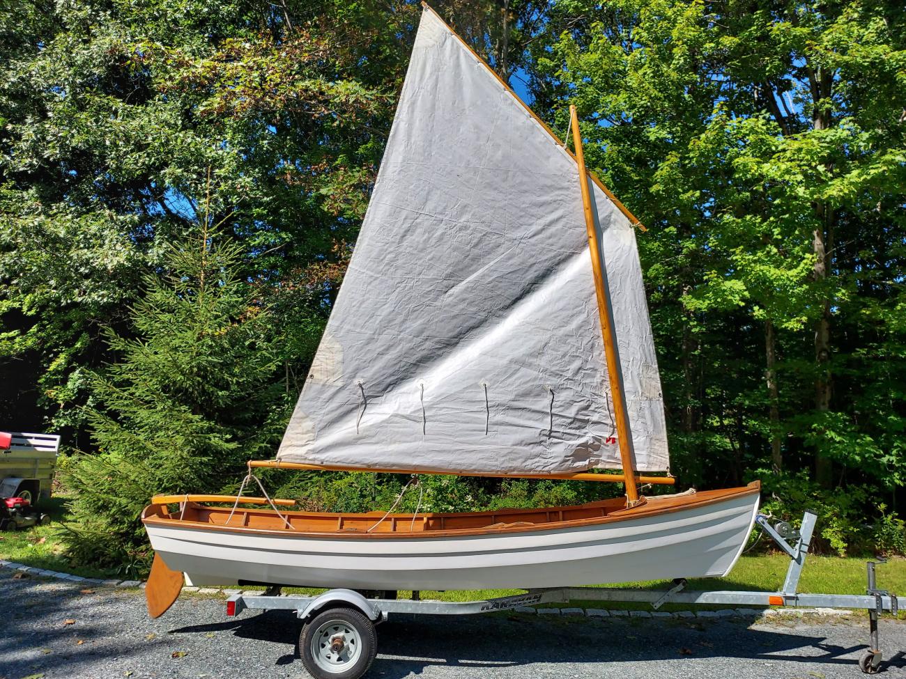 Cedar on white oak frames, knees, transom. Traditional construction. Complete lug rig with spruce mast, yard, boom.