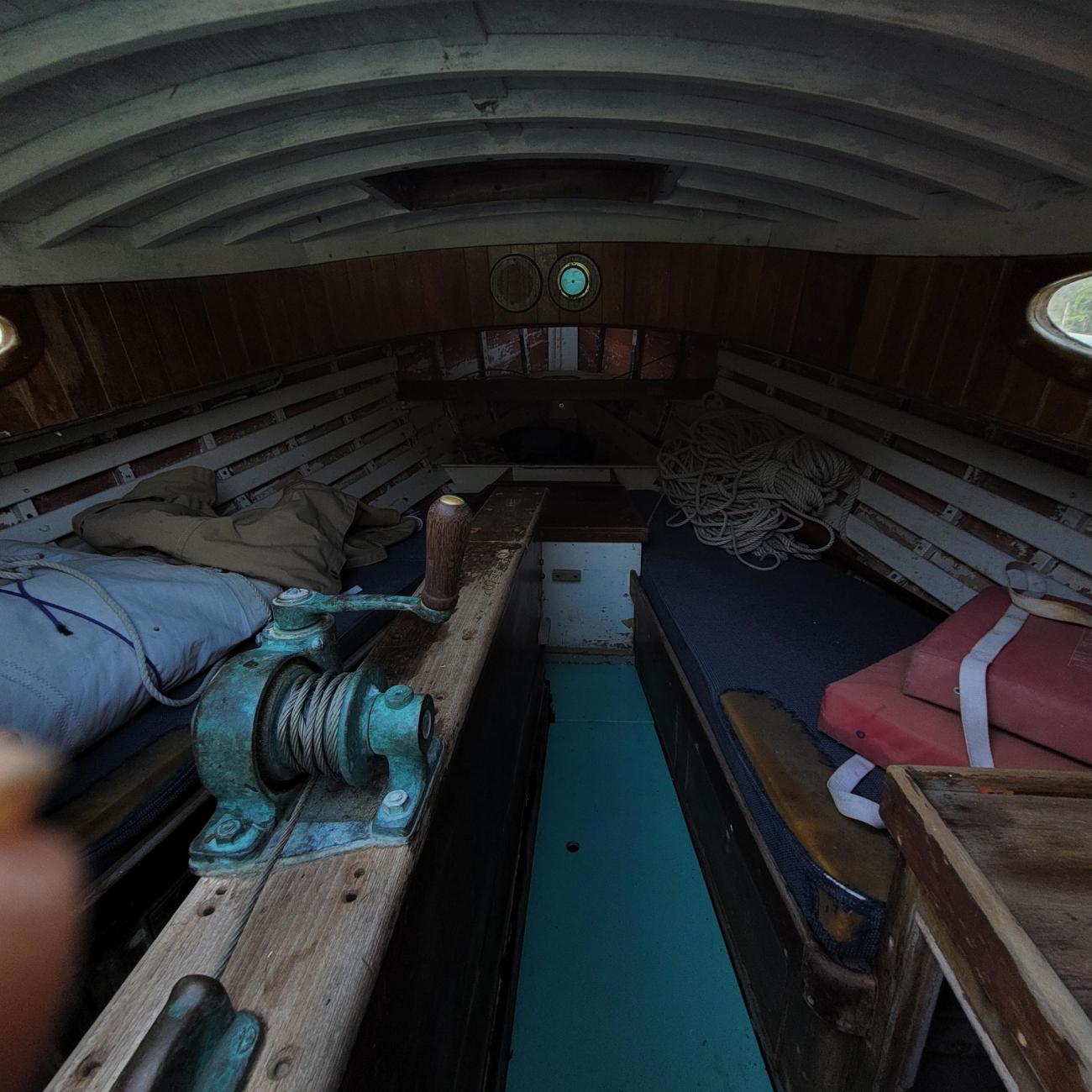 19.5' Teak planked and deadwood. Copper riveted. Hull is tight, sound and pretty. Decks, cabin top and coming in epoxy covered plywood. Original Volvo Penta MD1 engine. Sail and spars in fine condition. Cheoy Lee fittings and hardware are unique. Maintained by a sole owner for 50 years on the Maine coast.