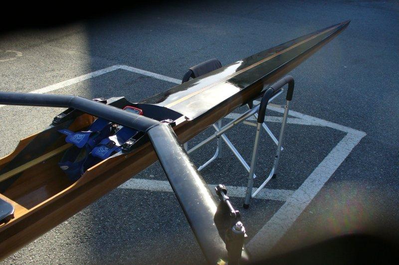 In June 2011, Richard Van Voris, the boatman for the Tabor Academy crew in Marion, Massachusetts, launched a 27′ x12″ single scull designed by Graeme King. Richard built the hull from 1/8″ red cedar strips , reinforced with carbon fiber, and covered with epoxy. He made the deck from a Nomax core laminated to a veneer of cedar. He uses a wing rigger created by Row Fit to row the boat on Cape Cod and throughout New England.