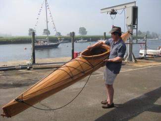 In June 2011 Paul Kueffner launched a cedar-strip kayak that he built for his wife from plans by John Winters. The Caspian Sea design is 15′6″ long, andabout 50 pounds with gear. He built the hull from 1/4″ western red cedar strips, covered with epoxy and 8 oz fiberglass cloth. He laminated Douglas-fir to form the interior stem and stern, then laminated oak on the outsides. He included minicel foam bulkheads to provide watertight flotation fore and aft, and Beckson hatch on the afterdeck. His wife, Sue, reports that the boat seems quite stable, comfortable, and fast. It is light enough for her to car top it by herself. Paul adds that she’s planning to explore the Long Island Sound coastline and nearby Norwalk Islands with her newly jealous friends who have kayaks of… other materials.