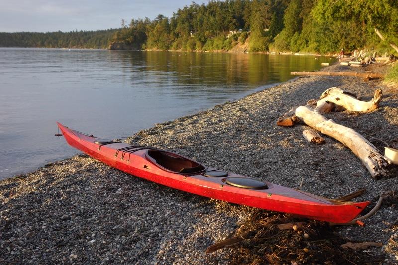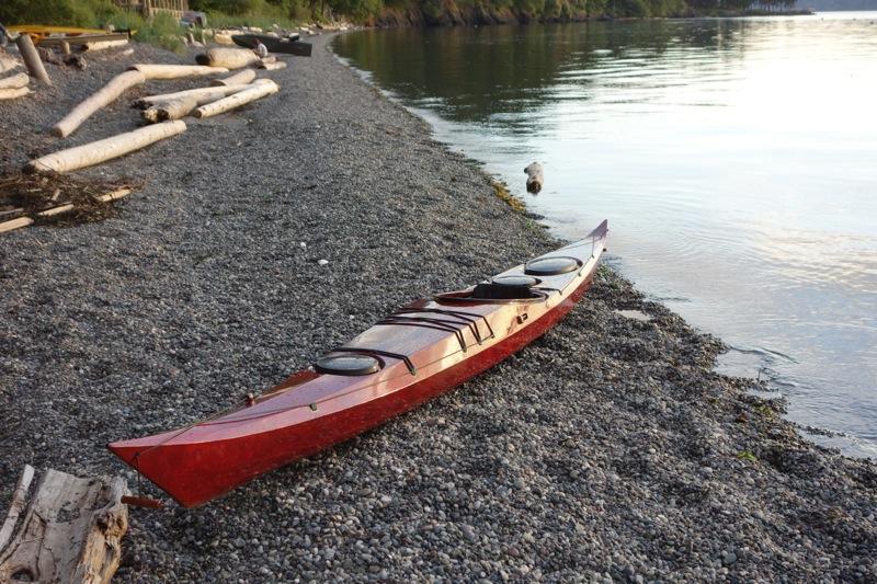 This is a Chesapeake Light Craft Petrel SG sea kayak. Construction is stitch and glue, fiberglass over stained Okuome ply. Custom changes to the kit included the soft pad eyes, dragonfly inlay, a carved skeg control housing and turned carrying toggles and paddle bead.