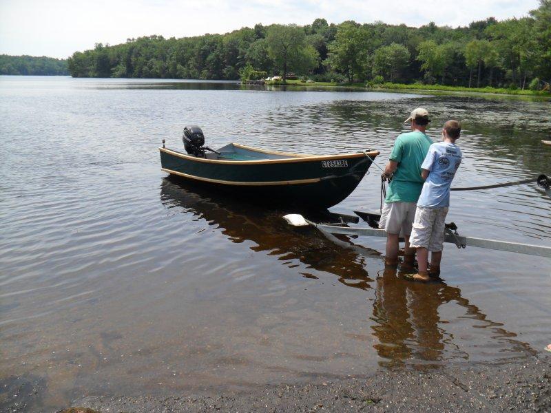 Taking plans and instructions from Dynamite Payson's plans and book, Build The New Instant Boats, Brendan Shea built this Diablo skiff, DY-NO-MITE, and launched her in July, 2011. The hull is 15′ LOA with a 5′ Beam, and is constructed from marine plywood with ash rails. Brendan customized the design by adding a small forward deck to support running lights. He takes his children, Liam and Katie on the Connecticut River, from Haddam to Hartford, as well as on local lakes. The 20-hp outboard drives the boat to 27 mph. In one photograph, the children are helping to launch the boat.