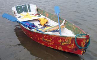Bill Bornemann writes that he "built this 9' long, 4' beam, plywood skiff inspired by Howard Chapelle's description of the flat iron skiffs in his book, Small American Sailing Craft. She was assembled and painted in one day as part of his 50th birthday celebration. Launched in Marina Del Rey on July 19, 2003, and christened GETTING A LITTLE BIT DINGHY, the boat is being very pleasantly used to introduce an upcoming generation of nieces and nephews to 'simply messing about in boats.'" Contact Bill at 4224-1/2 Glencoe Ave., Marina Del Rey, CA 90292 (email: BillBornemann@hotmail.com.)