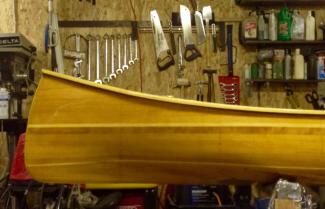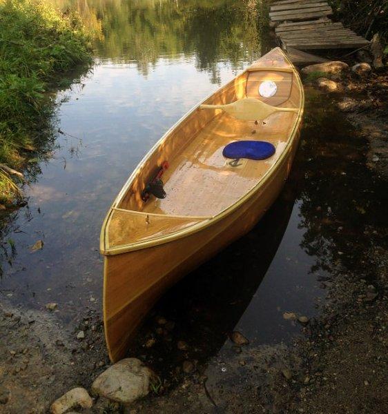 This canoe is based on the Laughing Loon Wee Vera plans for a 10ft canoe. I stretched the plans out to 12ft. It is a cedar strip design. The wood used is Red Cedar, Douglas Fir(one plank of quarter sawed DF accidentally got mixed in with the Cedar from the lumber yard!), Cherry, Ash, Poplar and African Blackwood! I added small waterproof compartments on the ends for dry stowage (so your wallet doesn't end up in the bottom of the bay!!, long story...). It is a really great solo paddler! A great design from Laughing Loon!