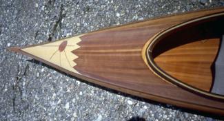 Doug Puckering launched two boats in May of 2004: a Steve Killing-designed 17' canoe and a Joe Greeley-designed 16'10' kayak. The canoe has a beam of 33-1/3" and weighs 50 pounds. Doug plans to use it in canoe segment of the Ski-to-Sea race on the Nooksack River. He used red cedar for the strip planking, Honduras mahogany for the trim, and yellow cedar for the sheer stripes. The kayak weighs only 36 lbs, with a beam just under 2.' He used a variety of wood in its construction: the hull is made of red cedar strips, bow canopy is from yellow cedar, stern canopy is of blue stain pine, Peruvian walnut was used for the trim, and the sun and moon decorations are from lacewood and spalted maple burl, respectively.