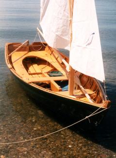 Robert Janoch was inspired to build a boat after taking a course from John Gardner many years ago. It took him quite a while to actually buy the plans for the Marblehead Skiff from Mystic Seaport, then it took several years to build the boat. The original plans called for a 14' boat, which he scaled up to 16'. He built the boat using white oak frames and ribs, along with marine fir planking, which he fastened with copper rivets. The transom is mahogany, thwarts are pine, spars are Sitka spruce, and the tiller and oars are from ash. The rig uses a sprit-rigged main sail with a jib.