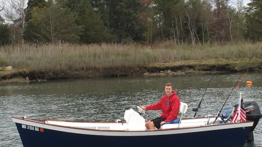 Fiberglass cloth/epoxy and marine plywood on pine frame powered by 30hp Suzuki. During construction of interior we added mahogany rail caps and a front anchor locker with seat and hardware. It was our first boat build and we intend to explore the coast of Massachusetts Bay, fishing and enjoying being on the water.
