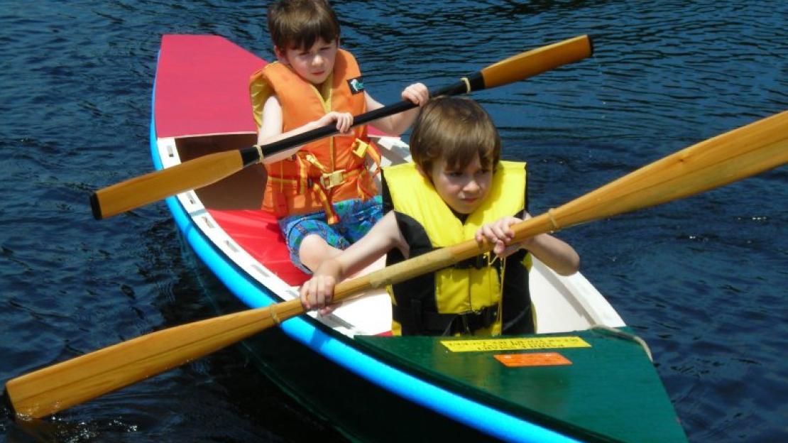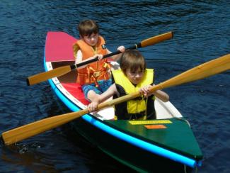 After the parts were cut from marine plywood by their grandfather, Tavish and Niam Rogers assembled their first boat using copper ring nails and polyurethane construction adhesive. The boys then painted the boat, attached foam swim “noodles” and decals to personalize this Fritz Funk design (Search “Wacky Lassie”). The boat is unsinkable and measures 11 feet six inches length, thirty inches beam at the gunnel. Puffin is propelled by double paddles that the boys helped finish.