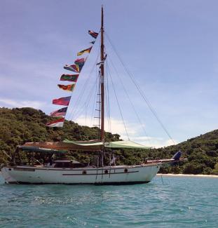 40′ on deck and 49′ with bow sprit, S.Y. RAVENSONG was built by Denis Brown in Ventura California and launched in 1934. Her hull is 38mm thick, single stripped plank construction of Californian Red Cedar from the giant redwood forests. Mast and spars are Canadian Oregon and Canadian Spruce. With new decks, new rig, new sails and new engine, she is in marvellous condition. Cutter sloop, Gaff rigged and 14T, Ravensong is a William Atkins Colin Archer with six berths, large chart table, fridge freezer, water maker and rum making distillation. She has circumnavigated twice and currently cruises Asia in search of surf.