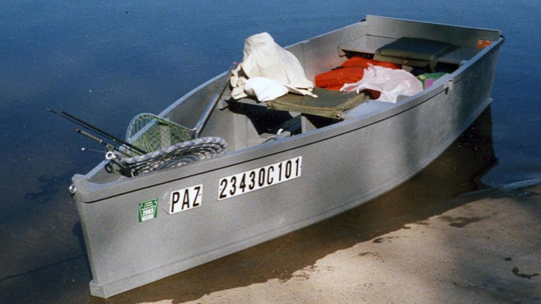 This boat was designed and built by Robert Wallace between October 2001 and May 2002. He launched her in May on White Oak Pond in northeastern Pennsylvania. The skiff has a 10' LOA and maximum beam of 39". She is a semi-V hull. Bob writes "It is rather unimpressive looking, but for my first time, I'm pleased. It didn't leak a drop since its launch. It maneuvers easily in the water. I'm catching fish! Your magazine and web site were a tremendous help." Contact Robert at send-it@att.net.