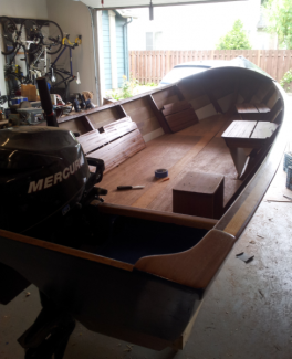 A Classic Gulf Stream fishing boat designed to be lightweight, and to take a following sea better than it’s Dory predecessors. The hull lines were from plans*, with some modifications to the interior. A laminated tow-rail and, fold-down seating in the cockpit among them. Materials are Hydro-Tech marine plywood (scrafed planks), Sapele Mahogany framing and trim, with clear Douglas Fir keel and stem.*(Dave Carnell’s plans for the Simmons Sea Skiff 18 are available from the Cape Fear Museum.)