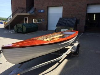 SUNDANCE II was built in 1975 at a yard in Essex, CT on lines from Nathanael Herreshoff’s sailing dinghy GARYOWEN [1926], which was in turn drawn after Design #568 [1901], “Colonia Sailing Dinghy.” In the late 1970’s SUNDANCE II was transferred to a series of museums where she fell into disrepair, and eventually came to Castine in 1985. The owner did some important repairs to the hull, but the boat remained largely unused. I bought her in July 2017 and did an extensive restoration on her, modifying her rig to the gaff sloop of the 1901 design, building new spars, mainsail, tiller and mast hoops, replacing bronze hardware, and of course, painting and brightwork. Just shy of her 45th birthday, she’s back in the water!