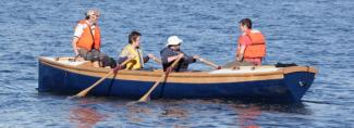 The Northwest School of Wooden Boatbuilding in Port Hadlock launched on June 14, three classic Whitehalls built for the British Broadcasting Corporation. The BBC used the boats in August 2013 to recreate John Wesley Powell’s 1869 exploration of the Colorado River through the Grand Canyon. The School built two 21′ Whitehalls and one 16′ boat. The 21′ boats were built of white oak under the direction of instructor Ben Kahn, while the smaller Whitehall was planked in larch over a white oak backbone and frames under the direction of the School’s senior instructor, Jeff Hammond. The white oak was provided by Newport Nautical Timbers of Newport, Rhode Island. Instructor Ben Kahn accompanied the boats down the Colorado River as a member of the cast, and served as the expedition’s shipwright, maintaining the ruggedly-built boats on a daily basis during the arduous 18-day trip. The boats will be sold by the BBC now that filming is complete.On a side note, one of the two 21′ boats was painted blue and the other one was painted green, while the 16-footer was painted a wine-dark Homeric red at the direction of the BBC’s producer, Cameron Balbirnie. While Powell’s boats were almost certainly painted white, the BBC’s producer felt that the TV audience would find it easier to keep track of the three boats on the river if they were painted different colors.