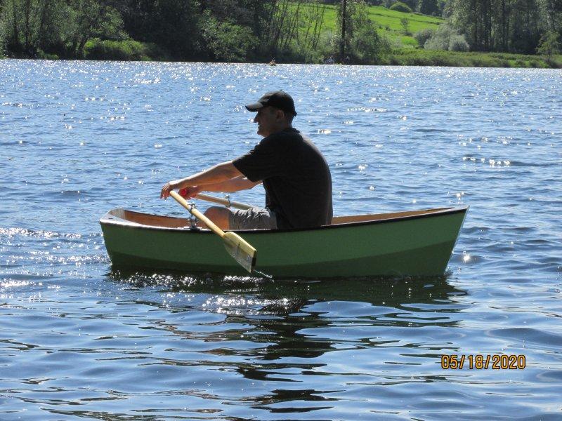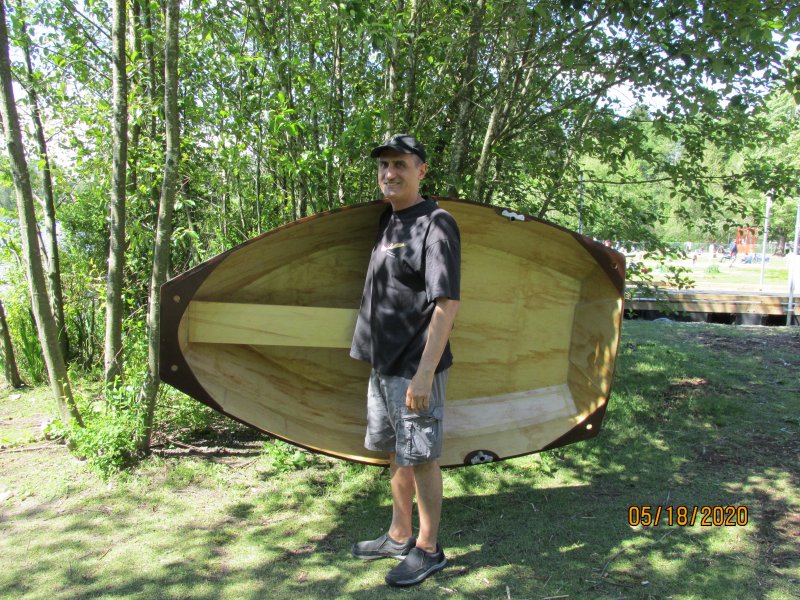 With a length of 6′-6″ (2m) “Dingo” is our shortest boat weighing only 28lb (13kg). Easy to car top, easy to take to the water and back, easy to launch from the mothership without breaking your back. With a beam of 4′ (1.20m) the boat is stable enough to stand up in. It moves swiftly across the water and is very maneuverable. All parts of the boat fit on two sheets of ¼″ (6mm) exterior grade plywood. Nesting of all components is shown to minimize waste. Stitch and glue construction with 3” (75mm) fiberglass tape in epoxy along the seams inside and out. A small outboard not more than 1.5HP or an electric motor can be mounted on the transom. In that case the addition of emergency floatation underneath the bench is recommended. A bench for a passenger can be added in the stern or even better a full length transom to transom longitudinal seat can be installed. It will allow for better distribution of crew weight in order to keep the boat properly trimmed. If the boat is going to be used by two people then a second pair of oarlock sockets will need to be installed further forward. Maximum crew plus gear weight should not exceed 400lb (180kg). “Dingo” is a very suitable boat for fishermen, birdwatchers, nature photographers or as a tender of a bigger boat. It can be built for less than $300 CAD (2020). Here is the bill of materials: