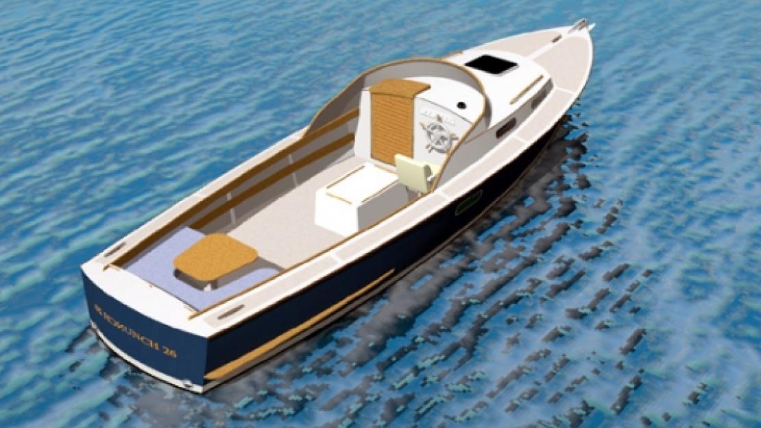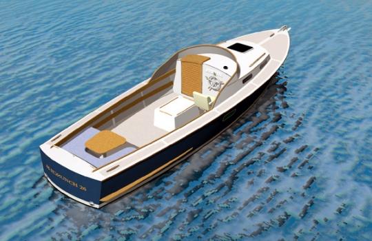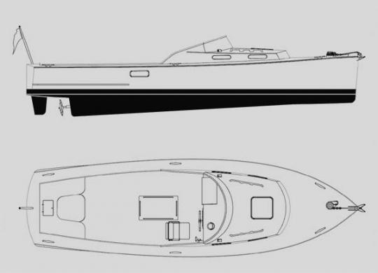 The program of the Fast Launch 26 was an easy to build, economical, classic looking, semi-displacement commuter style boat. Easy to build with her flat bottom, classic looks with the Sparkman-Stephens Escort look, offshore capable thanks to her size, generous flare, good sized skeg and inboard diesel. Her hull lines are well balanced and she will perform well in a wide range of speeds from economical displacement speed ( 7mph) to semi-planing at 18 mph with the 50 HP engine option. Moderate stern volume and fine entry combined with a good size skeg will keep her on track in bad weather. The fine well immersed bow will reduce pounding and the generous flare in the topsides not only looks good but add reserve buoyancy. Draft is a moderate 22" with a well protected propeller. Shaft and prop will not suffer from occasional grounding.
