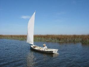 I developed this boat for my own use in the coastal Georgia marshes. In this area there are miles and miles of narrow winding tidal creeks surrounded by tall marsh grasses. Birds and other animals abound, and quietly sneaking up on wildlife was one of the primary reasons for this design. The water in these creeks is surprisingly deep, but they are so narrow and winding that, much of the time, sailing is hopeless. You just get the sail up and drawing, and the creek will turn, changing your beautiful reach into a fruitless beat. There are pretty strong tidal currents as well, so rowing your way out of this situation can be exhausting. Therefore the design of this skiff was driven by the search for easy electric powering, with sailing and rowing secondary.See our website for more information about this design.