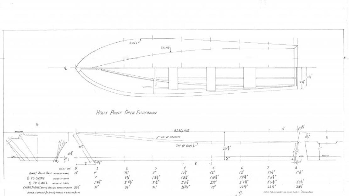 FREE plans — Holly Point Skiff, aka Holly Point Open Fisherman.It’s time we got back to the fuel efficient hull forms, and here’s one that will give the thrill of planing speeds, with the economy of a skiff. It is a large, lightweight power dory with extreme flare in the forward sections for dry running and seaworthiness. I hear folks have to pool their money nowadays to go fishing in their overpowered gas sucking monsters. The long lean hull with a flat bottom is the most you can get for your money and building time. This one rides on a bubble curtain and slices the chop — no pounding like wider flat bottom hulls.23′ LOA by 6′ beam open power dory. Flat bottom with waterline beam of 4 feet for maximum speed, will plane with 15 hp, will carry 6 adults at 20mph with 25hp. Two layers of 1/4 inch plywood over moulds epoxy fiberglass outside (three layers of tape on the chines), epoxy coated inside. Three stringers are 2 x 4’s — all pieces lumber yard stock. The most boat that will cruise at planing speeds easily, with large load capacity and the seaworthiness of the dory flared sides. The least amount of building time and materials cost. I will be happy to email the building instructions and detail figures.