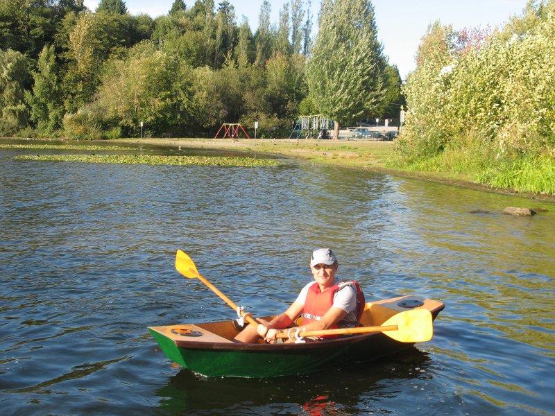 If you enjoy rowing and need a boat which can be built quickly, doesn’t cost much, and is easy for transportation and storage then this tiny vessel might be for you. “Mighty Mouse” is the adult version of our one sheet mini punt “Mickey Mouse”. The design features a more streamlined hull for better speed, higher free board for increased load capacity and reserved buoyancy. There are emergency flotation (storage) compartments in the front and back. The boat is symmetrical in reference to amidship which facilitates construction even more. Building method is stitch-and-glue. The separate panels of the hull get stitched up with copper wire (zip ties) and then “welded” by epoxy and fiberglass tape. Instructions describe in detail every step of the process with a lot of photos. All parts of the boat can fit on one and a half sheets of 1/4″ (6mm) exterior grade plywood. In other words, two friends can buy 3 sheets of plywood and build 2 boats. Nesting drawing is provided too for best use of material. The finished hull weighs around 35 lbs (16kg). Propulsion is by oars. The boat is tender and care must be taken when boarding. Once seated though she gets more stable with a certain amount of secondary stability similar to dories. The seat is comfortable with a backrest (unlike most other rowboats) and the rear bulkhead serves as a perfect foot brace. When testing the prototype I manged to stand up in the boat but wouldn't do it regularly. Once under way this little shell is really fast and lively. Included are drawings for a removable seat and oars. With her narrow beam the boat is ideal for car topping and can be easily transported by one person from the car to the water and back. Here is the bill of materials:· Exterior grade plywood 4x8′(1220x2440 mm), ¼″ (6 mm) thick – 1.5 sheets;· Fiberglass tape 3″ (75 mm) wide by 6 oz.(200 gr/sq.m) – 16 yards(15 m);· Epoxy resin – 1 gallon (3.78L) plus hardener;· Others – bread flour, chip brushes, rollers, fairing compound or filler, paint, sandpaper;Plans package consists of 4 pages of drawings (metric or imperial) and 11 pages of instructions with photos.Price is $20 CAD. After payment is processed you will receive an e-mail with a PDF attachment.Plans in imperial units are set up to print on letter size paper at the convenience of your home printer. Metric plans are set up to print on A4 size paper.