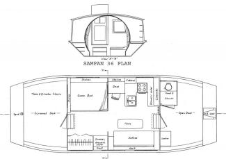 The SAMPAN 36 HOUSEBOAT is a simple, pragmatic floating home suitable for a couple with a child. It is self-contained and intended for use in a marina or at anchor. It may employ an outboard motor, or simply be towed to a semi-permanent mooring. Construction employs full sheets of plywood for simplicity.L.O.A. 36′L.W.L. 31′ 11″BEAM 13′ 8″DRAFT 1′ 6″DISPL. 24,000 lbs. LadenTYPE Sampan-style HouseboatPOWER Outboard in well, 25 to 50HPACCOMMODATION Sleeps two in queen-size berth; one on settee; guests on screened deckTANKAGE 800 gallons water, with optional roof-collection; 100 gallons holdingCONSTRUCTION Cold-molded wood. Hull: Two layers of ¾″ ply laid 90 degrees to eachother, ¼″ teak and holly ply laid inside. Decks: ¾″ plywood. Cabin sides: 3/8″ bead-board ply over 2x2 studs; 1/8″ paneling inside; Polyurethane foam core. Roofs: ¼″ ply over laminated beams; 1/8″ headliner, Polyurethane foam core. All exterior wood fabric/epoxy covered, polyurethane painted.CONCEPT Houseboat for a couple, with a small child and occasional guests. Construction designed for ultimate simplicity and low cost. Not intended for use in open or rough waters. Foam-core uses common household “scoreboard” polystyrene 1 ½″ foam for strength, low cost and heat/cold retention.PLANS By Reuel B. Parker PARKER MARINE ENTERPRISESPlans include full-size Construction Section Drawings, Construction Notes, large-scale blueprints and a copy of The Sharpie Book (construction manual). Full Plans are $125 and can be purchased on line at www.parker-marine.com.