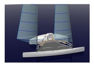Wantoo is designed by the Dutch designer Nol Twigt for the WoodenBoat Design Challenge III. The proa concept is choosen for simplicity and speed. Both inside and on deck there is a lot of room to live. A real double bed is unique inside a trailerable multihull. Other qualities of the concept are a sheltered place to sit outside and unlimited view in the leeward and forward direction. The main weight in the windward hull guarantees speed and stability.