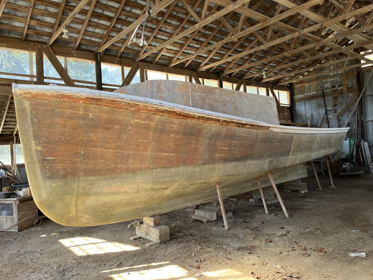 Following 60 years of service, the CLARA JOYCE was retired and later placed in boathouse for an extensive overhaul. Cabin and decking removed, she underwent a full rebuild of the hull as well as replacement of aft and side decking. All original fasteners were replaced with galvanized bolts and stainless-steel nails. Majority of ribs were replaced, eliminating any of concern. To fully preserve, the hull was completely epoxy glassed. Keel extremely sound and heavily glassed. Shaft remains in place. All original documentation. In dry storage and available to view by appointment.