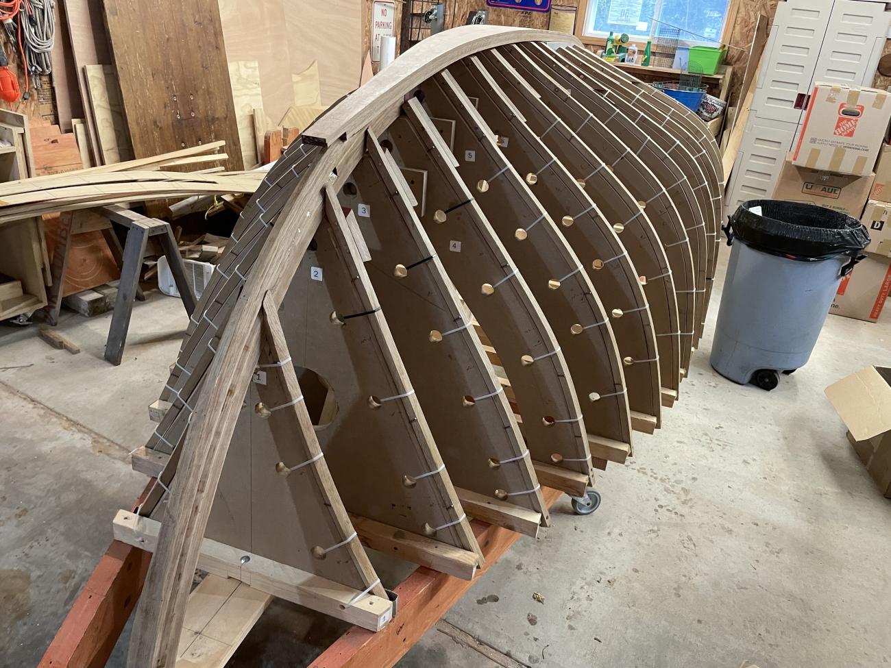 Haven 12 ½ strongback (16’ 2 ½“ X 51 ½“ laminated beam timber) on wheels, 22 faired molds (MDF), stringers (1/2” scarfed plywood). Disassembled with hardware. Northbrook IL.