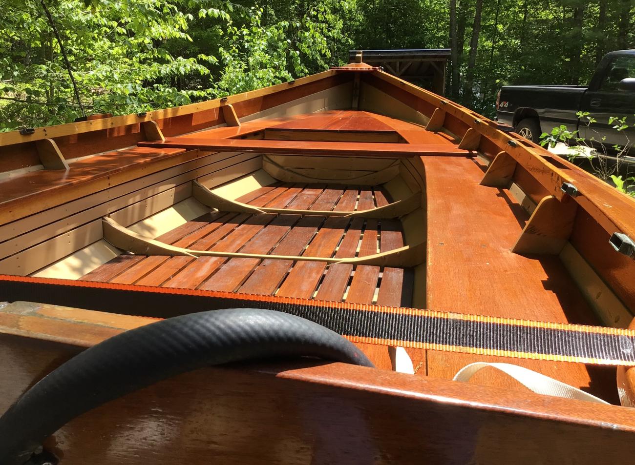 Excellent condition and freshly painted, custom 16’ Amesbury Skiff 2003, Oak Frame, lapstrake cedar planking, Mahogany Transom and seating, by Lowell’s Boat Shop, Amesbury Ma. Sale includes a 25-hp Johnson outboard motor, in excellent condition, and a 2023 Yacht Club, bunk style trailer. This boat has a fiberglassed bottom and garboards, built in floatation, Bow Locker, gas tank newer battery, canvas boat cover, anchor and rode and a throttle extension. Great deal on a New England Classic!