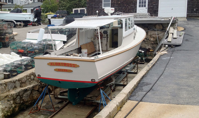 ALBATROSS looks right at home hauled out by owner Mike Coyle at a lobsterboat slip belonging to a relative in Noank, Connecticut. The boat was hauled only for routine below-the-waterline work; Coyle was able to do much of his work on the boat while she was still in the water.