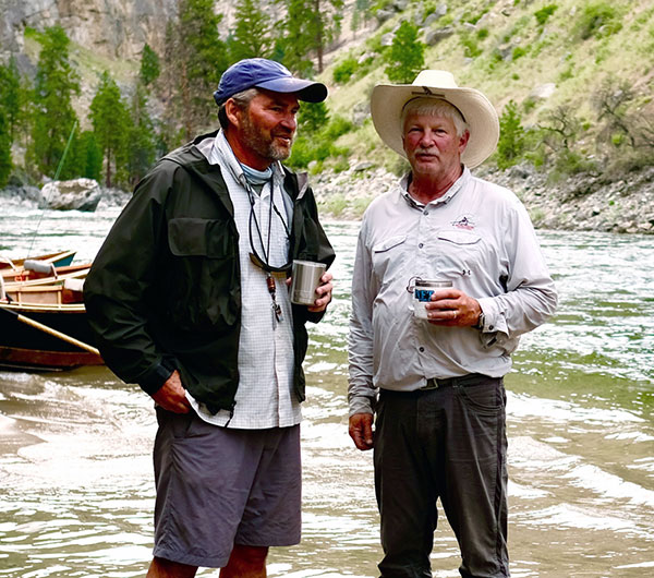 Author Greg Hatten (left) and Ken Helfrich relax before dinner on the last evening of a 100-mile trip by six wooden drift boats down the Middle Fork of the Salmon River.