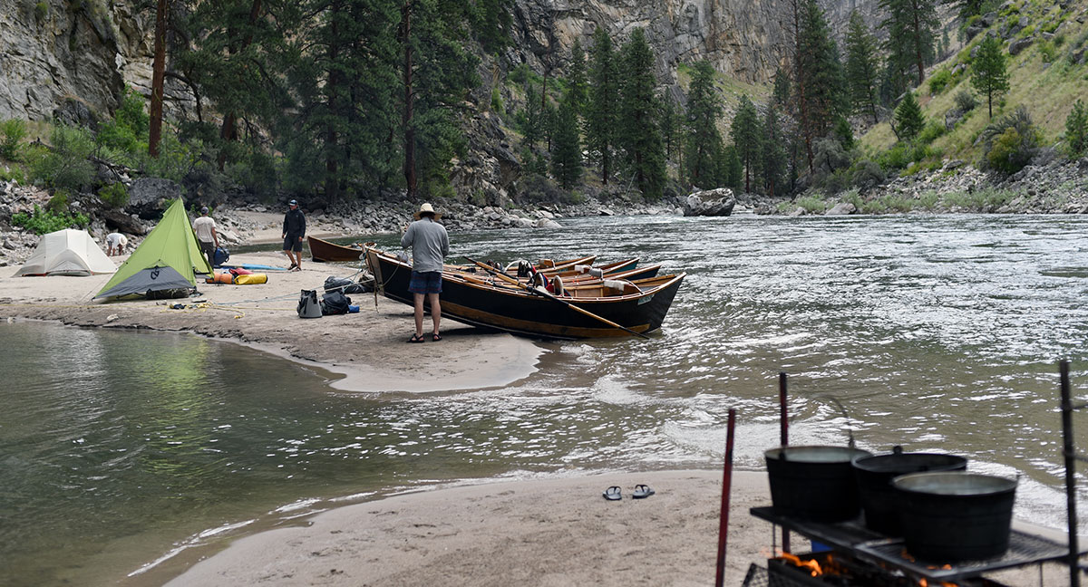 Wooden drift boats, which were developed for running western whitewater rivers, look right at home at camp.