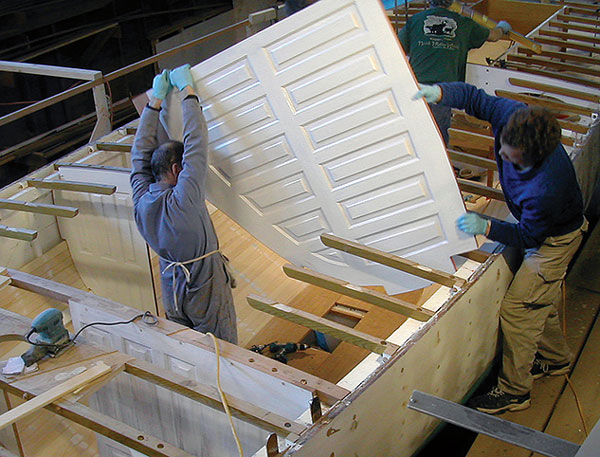 Working on an interior becomes much more efficient without the cabin in place. This built-off-site trunk cabin goes on only after most interior work has been finished and painted. Here, the push-button-controlled electric hoist makes the fitting an easy matter.