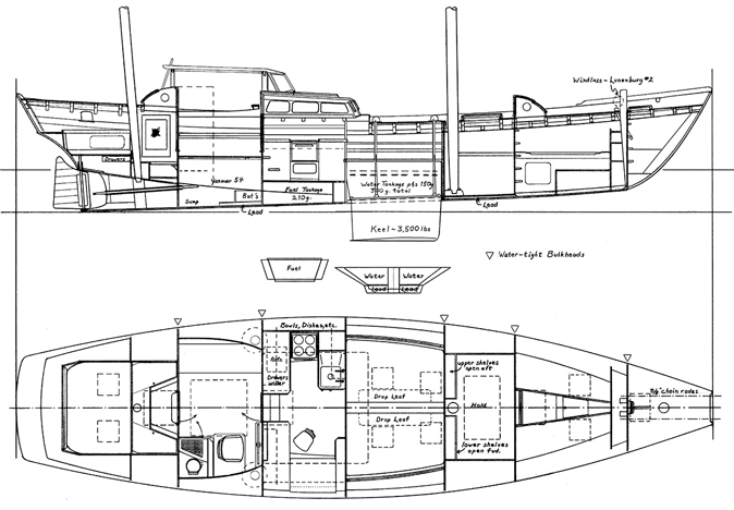The Pilot Schooner 60 LEOPARD’s Plan & Inboard Profile, showing the head to port in the forward sleeping cabin.