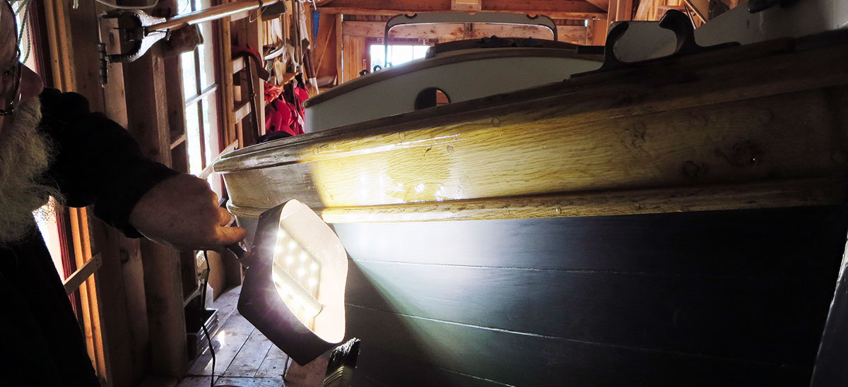 In the subdued natural lighting of a boathouse, the handheld LED lamp accentuates the difference between sanded surfaces and new finish, in this case varnish on the sheerstrake.
