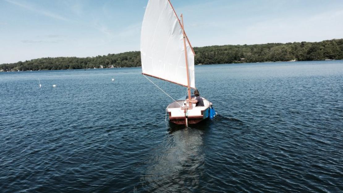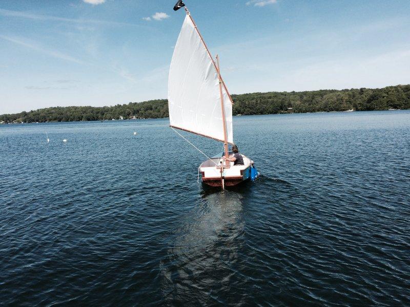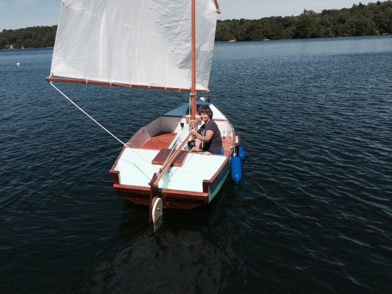 The Lady Bug design by Jim Michalak is intended to be a quick-onto-the water, plywood, house painted boat. Together with boatbuilder Greg Hopkins, we decided to upgrade some and use better materials. The plywood is marine grade, there are teak fittings and she is glassed. Greg designed a hammock which fits across the cockpit, to allow for naps or the occasional short cruise. The result is possibly the fanciest Lady Bug on the water anywhere. I was attracted by the concept of a commodious and comfortable boat for a days’ sail with friends ( no more perching on slim thwarts or down in the bilge), coupled with the possibility of using the boat to do some gentle cruise camping with my twelve-year-old daughter. I couldn’t be happier! She is a delight to sail and will I know provide many happy hours of enjoymet for me, my family and friends.
