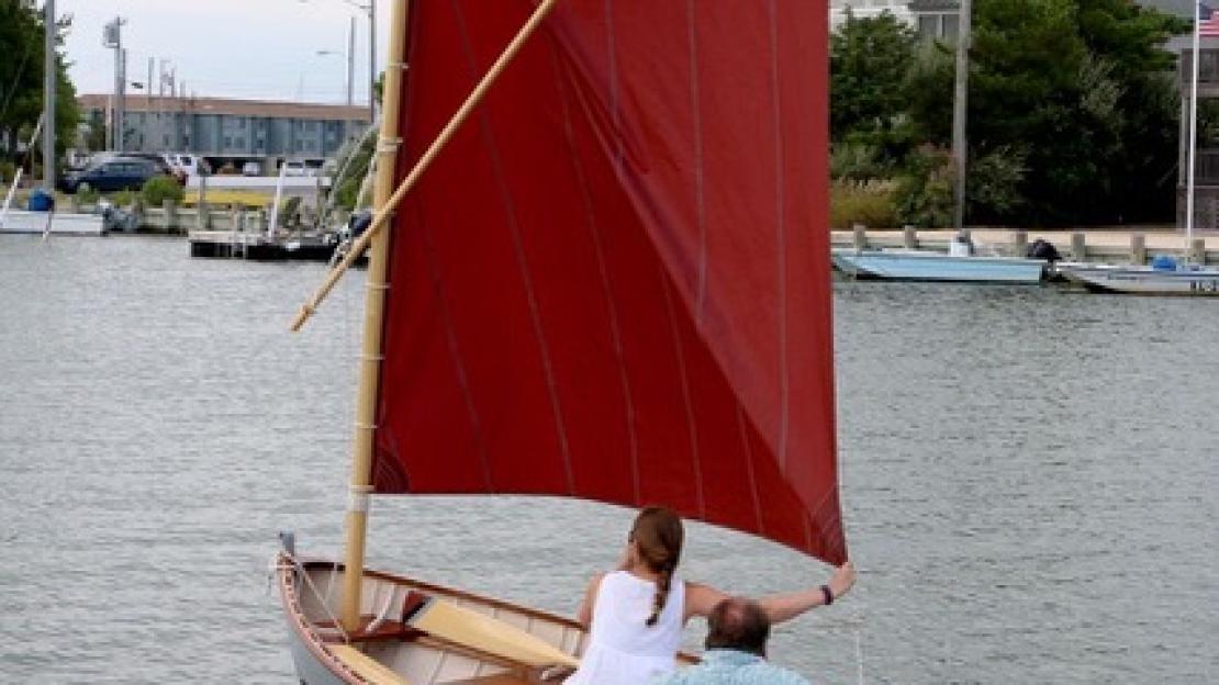 This is a cedar-on-oak Catspaw Dinghy, fastened with bronze screws. The stem is a single piece- without stem knee or joint of any kind- of American Larch, and the keel and transom knee are white oak. The transom, thwarts, inwales and outwales are mahogany; inwales and outwales are through-riveted with copper. The centerboard trunk is marine plywood (sapele?), and the centerboard is a solid piece of mahogany with a 14-pound poured lead insert. Rudder is a single piece of cedar, and the tiller is white oak. Spars are Sitka spruce and the oars are Shaw & Tenney standard 8' spruce rowing oars. Cordage is 5/16″ synthetic line. She carries ~61 square feet of nylon sail, tanbark in color. Anchor is small, Danforth-style galvanized steel, attached to 50′ of 5/16″ line with shackle and 4′ of chain rode.Bottom has two coats of red lead, three coats of bottom primer, and three coats of reed bottom paint. Boot stripe is three coats of gloss black over three coats of primer. Topsides are three coats of medium grey over three coats of primer. All paint and primer coatings are George Kirby, Jr. Paint Company products. Brightwork has, depending on what it is, 12 to 24 coats of Captain varnish.YANKEE DAHLIN' was begun by a Fundamentals of Boatbuilding class at WoodenBoat School in Summer 2014. Owner’s 2015 Fundamentals class brought hull to point where it could “go home.” The owner transported the hull via truck from Brooklin, Maine to Beach Haven, Long Beach Island, New Jersey, where he completed construction, and painted her during Winter 2015-2016. Spars were fashioned and she was rigged early Summer 2016. YANKEE DAHLIN' was launched August 2016 at Little Egg Harbor Yacht Club, whence she sailed 2016 - 2018. Since 2018 she has sailed from Chester River Yacht & Country Club, Chestertown, Maryland.