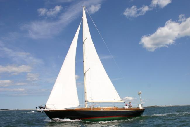 34' gaff rigged lee board ketch, 18" draft, mahogany on oak hull.
